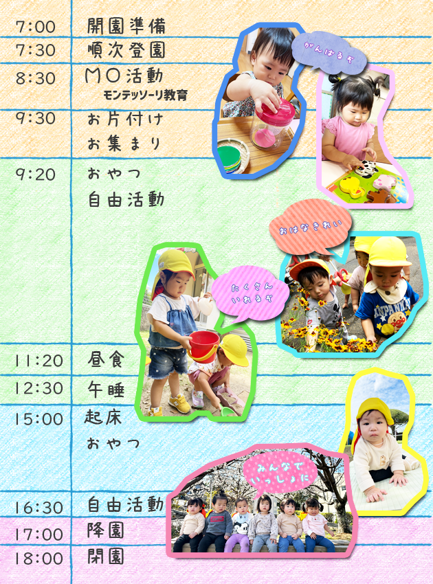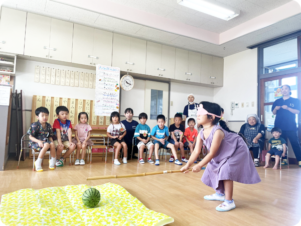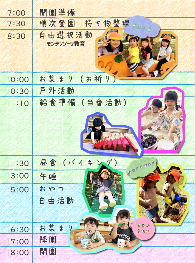 3・4・5歳児プログラム 0・1・2歳児プログラム 定例活動 身体測定・誕生日会・避難訓練・内科検診・歯科検診 運動会 スポーツ教室 月に数回、活動中です!! 防災訓練 避難訓練及び消化避難訓練は、毎月1回実施 地震・津波訓練と不審者侵入訓練は、年に1回以上実施 総合避難訓練は、年2回実施。※消防署立ち合い 防災設備:自動火災報知機・誘導灯・カーテン等防災処理・火災非常通報装置など